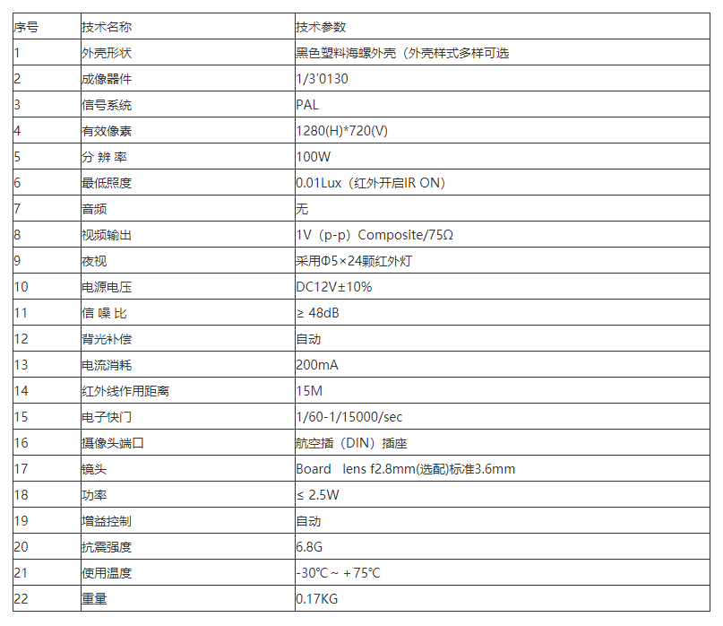 车载监控摄像头使用DC12V供电,与显示或者录像机配合使用,适用于汽车等场所进行安全监控。