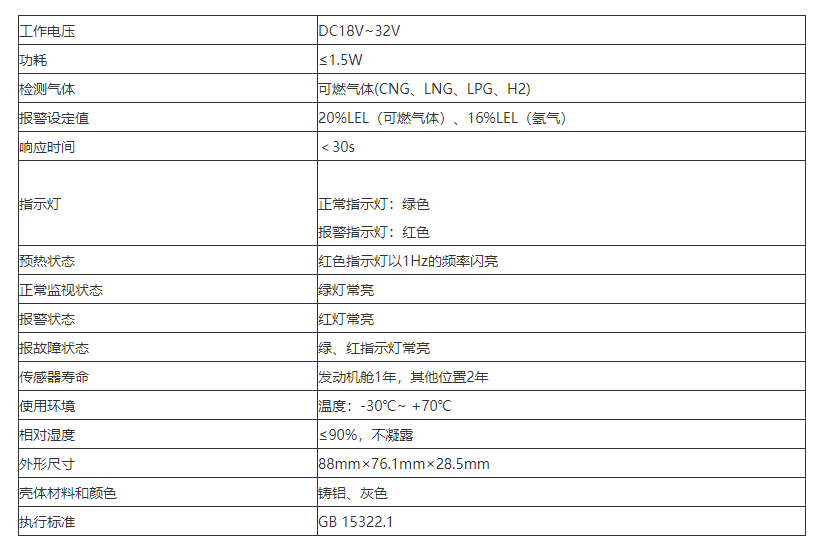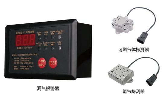 主要适用于LNG、CNG天然气、LPG液化气在车辆上的泄漏监测和报警,同时检测和显示发动机舱或电池舱温度,提高车辆行驶的安全性。本系统由可燃气体探测器、温度传感器、漏气报警器组成。